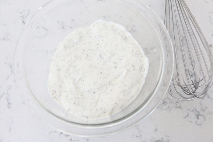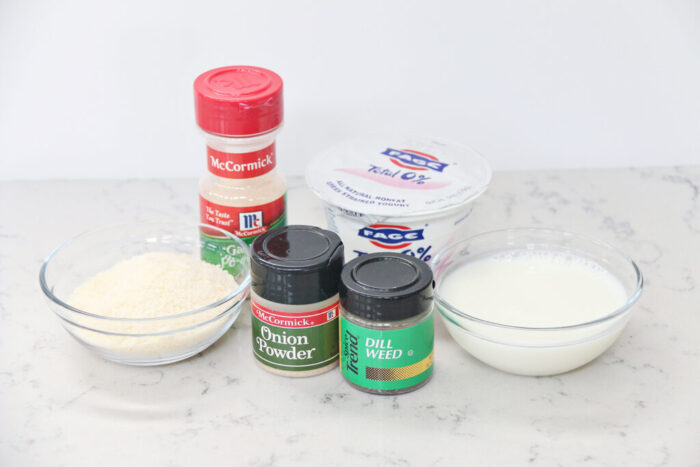 - Whisk together yogurt, buttermilk, parmesan, dill, garlic powder, salt and onion powder.